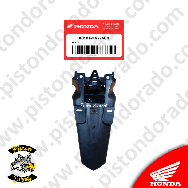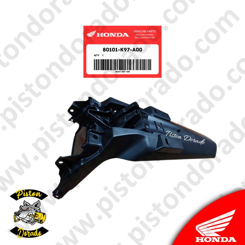 Tapabarro posterior tipo A, repuesto original Honda, diseñado para motocicletas PCX150 fabricadas entre los años 2018 y 2020. Este componente protege la parte trasera de la moto contra el barro, agua y residuos del camino, manteniendo tu moto limpia y segura.